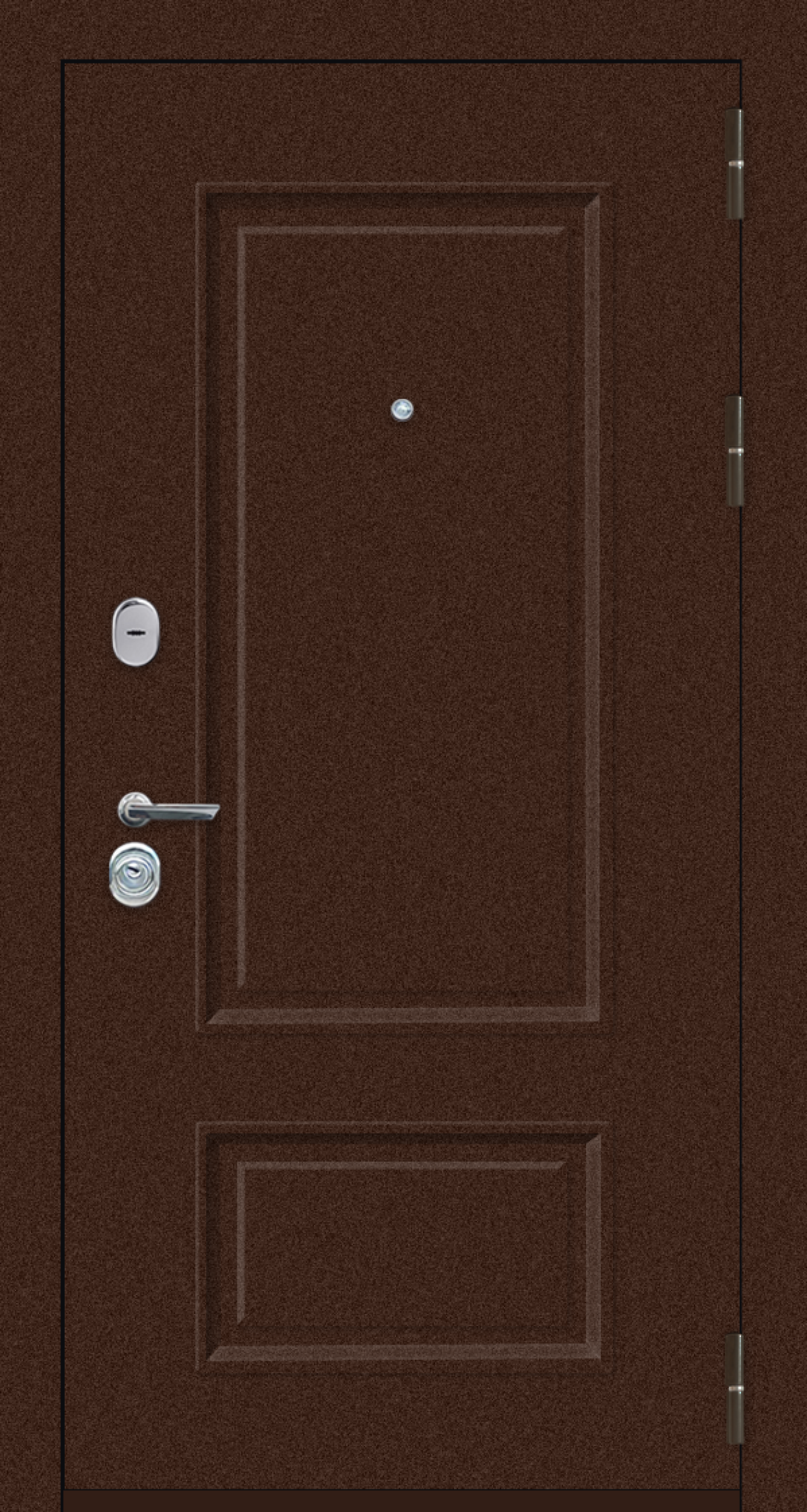 Технология беспустотного заполнения полотна и три контура уплотнения защищают от шумов и запахов со стороны подъезда. Надежная замковая система из замков 4 уровня взломостойкости усилена броненакладкой.